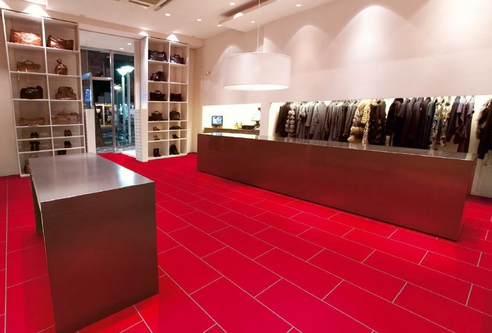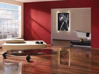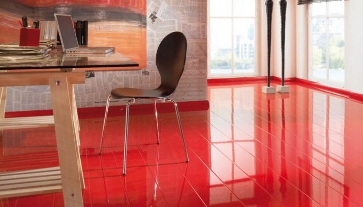 Die rote Farbe des lackierten Bodens ist sehr beliebt. Dieser Boden wird ein helles Detail in einem minimalistischen Interieur sein und betont die gewagte Freiheit des Lofts. Hell und gesättigt, wird es garantiert Aufmerksamkeit erregen. Aber diese Farbe auf den Bodenbelag sollte vorsichtig sein: ein Überschuss von Rot wird Unbehagen verursachen. In der Partnerschaft zum roten Boden sollten Sie die Möbel sorgfältig auswählen und die Wände in zurückhaltenden Farben anordnen. Um eine helle Farbe zu erhalten, können ein paar Accessoires passend sein.