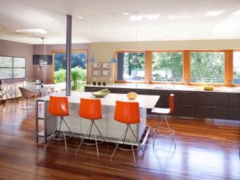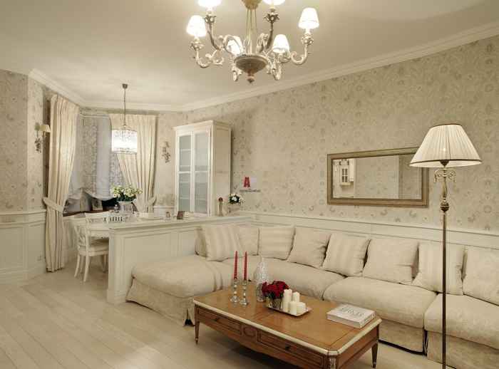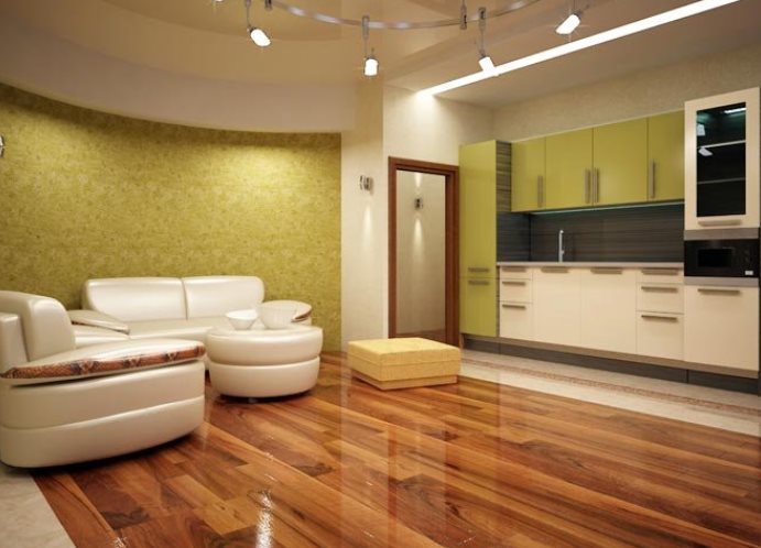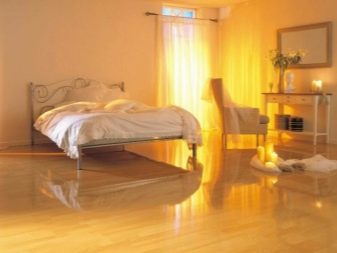 Welche Möbel auch immer im Raum sind, sie heben sich erfolgreich vom hellen Hintergrund des Bodens ab Sie können sich ohne zusätzlichen Aufwand auf diese konzentrieren. Der helle Boden lässt sich nicht dominieren über den Rest der Farben im Inneren, er kann sie nur betonen. Darüber hinaus zieht die helle lackierte Oberfläche des Bodens Licht an, wodurch die Beleuchtungsstärke des Raumes deutlich erhöht wird. Bei richtiger Auswahl der Möbel erweitert ein heller Boden mit einer Lackierung optisch den Raum.