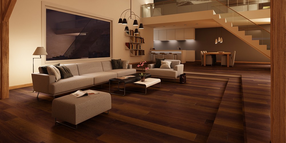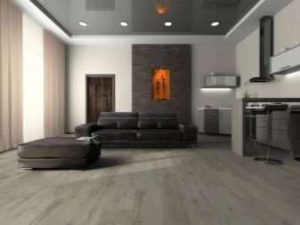 Das Loft-Stil Wohnzimmer sieht gut aus auf einem dunklen Boden imitieren eine natürliche Holzbasis. In Kombination mit einer Natursteinfassade fügt sich das Laminat perfekt in das Gesamtbild der Wohnung ein.