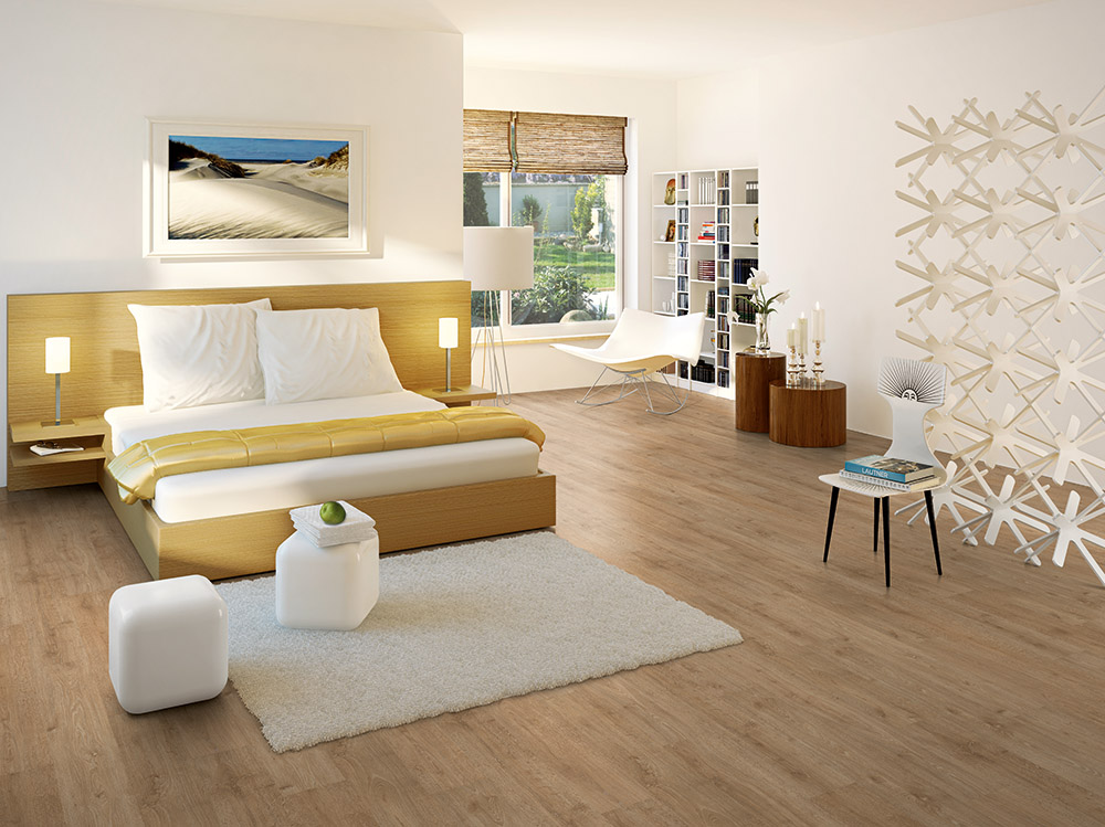 Für ein Schlafzimmer in weißen Farben kann Laminat der einzige Farbakzent werden, der dem Interieur eine tiefe, gemütliche Atmosphäre verleiht.