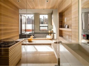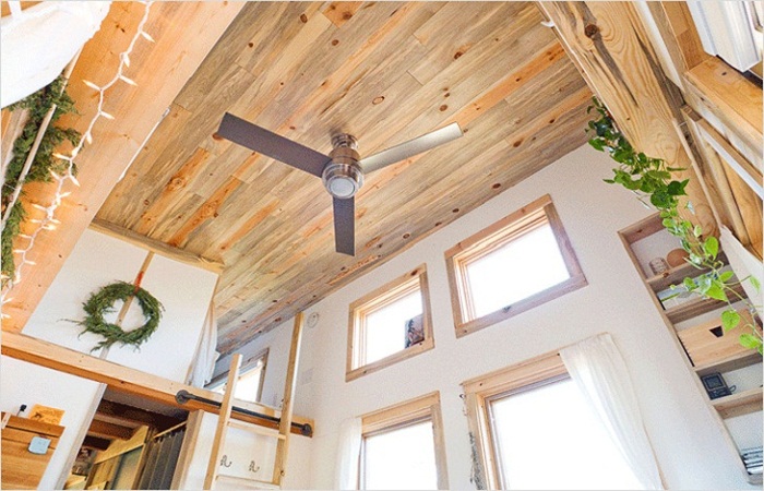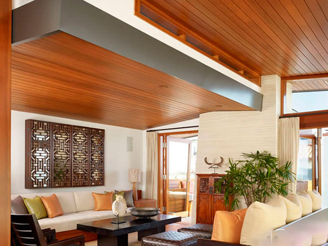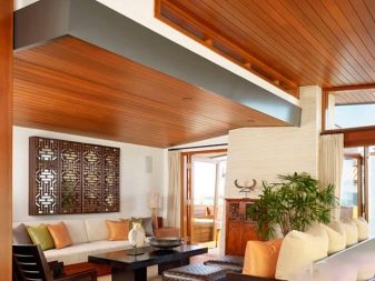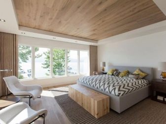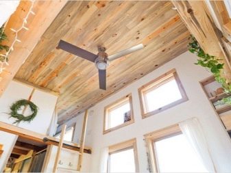 Die Deckengestaltung der leichten Bretter (aus gebleichter Eiche, arktischer Eiche, karelischer Birke) wird von den meisten Designern empfohlen. Nicht weniger attraktive Töne können aussehen helles Walnuss-, Kiefern- oder Aschemassiv.