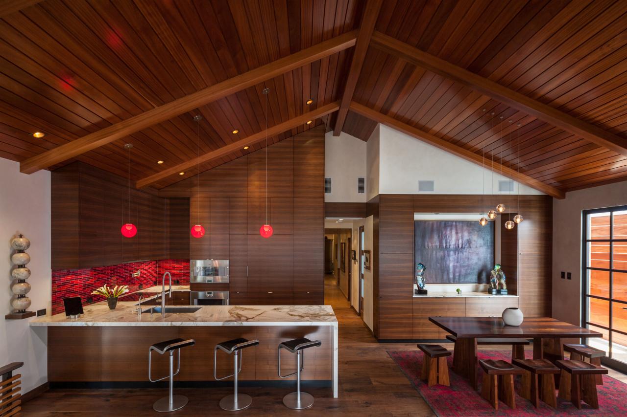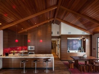 In der Art High-Tech es ist besser, die Decke mit Nachahmung der Metallschicht zu beenden. Für Empire-Stil Es gibt nichts Besseres als die Art von teuren Holzarten, und gotische Liebhaber sollten sich die Möglichkeiten mit der Reproduktion der Steinart genauer ansehen.