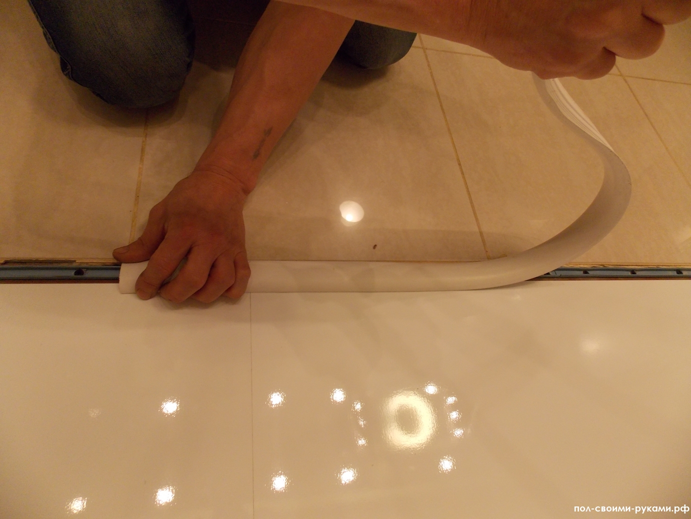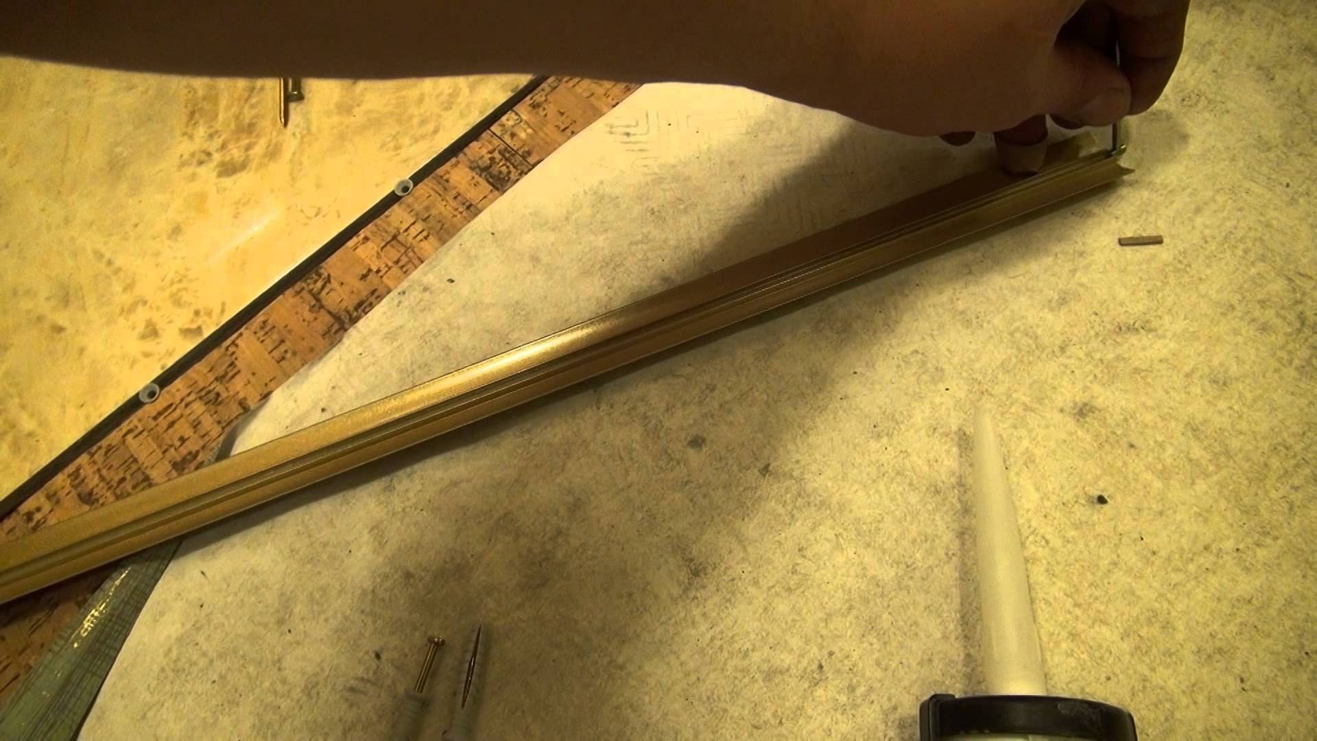 Das Dekorationsbauteil muss mit der Montagehälfte verbunden werden spezielle Schlossverbindung. Auch die Mutter kann durch Drehen auf einen speziellen Kleber montiert werden. Dies kann die klassische Zusammensetzung von PVA, flüssige Nägel oder andere sehr starke Optionen sein. Sie müssen auf der Rückseite der Auskleidung aufgebracht werden, danach können sie an der Verbindung von Bodenbelägen verlegt und für eine hochwertige Befestigung stark gepresst werden.