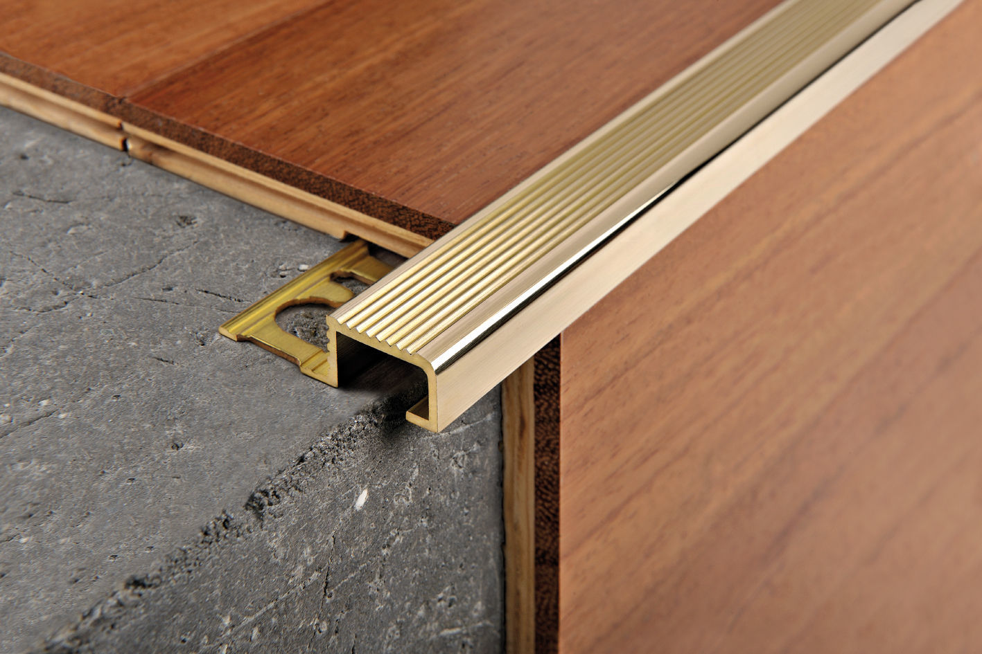 - Mehrstufig. Solche Schwellen der klassischen oder nicht standardmäßigen Form zielen darauf ab, die Höhenunterschiede zwischen dem Finish für den Boden, der unterschiedliche Breiten aufweist, auszugleichen und zu glätten. Dieser Parameter kann in Werten von 1,5 bis 10 cm variieren, und die Höhe des nivellierten Unterschieds zwischen Beschichtungen erreicht oft 20 mm. Montagesysteme in solchen Strukturen sind die gleichen wie in einstufigen Versionen: offen oder geschlossen. Für die Bearbeitung von Materialien mit unterschiedlichen Breiten und Höhen kann eine mehrstufige Schwelle mit einer speziellen Fixierungskante in Z- oder L-Form gewählt werden;