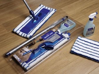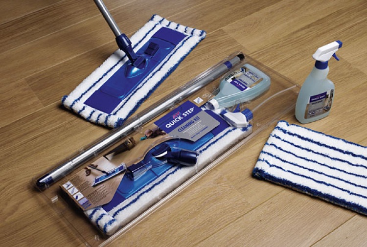 - Die Trockenreinigung der Böden erfolgt mit einem Staubsauger oder einem speziellen Quick Step Wischmopp. In diesem Fall muss der Staubsauger weiche Räder und eine Bürste zum Reinigen des Bodens haben.