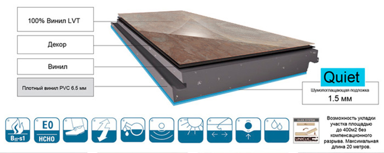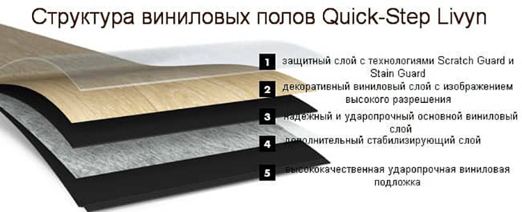 Vinyl-Laminat hat eine etwas andere Struktur. Es besteht aus fünf Schichten: