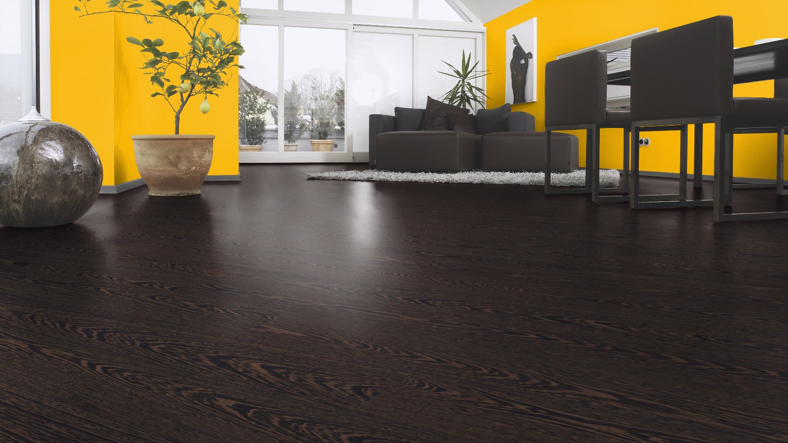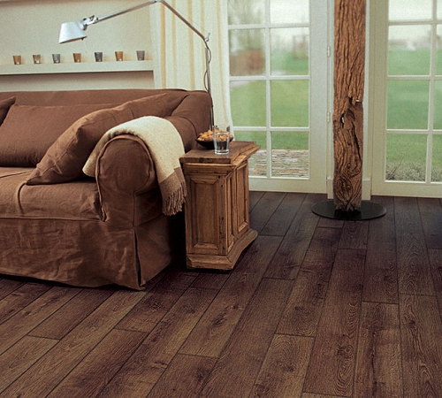 - In diesem Fall imitieren quadratische Lamellen perfekt Massivholzböden. Die reiche, dunkelbraune edle Farbe des Laminats fällt sofort mit seiner satten Erscheinung auf. Ein solcher Bodenbelag betont nicht nur die Raffinesse des gesamten Innenraums, sondern wird auch zum Highlight.