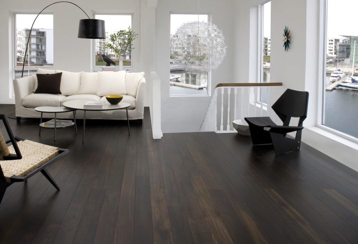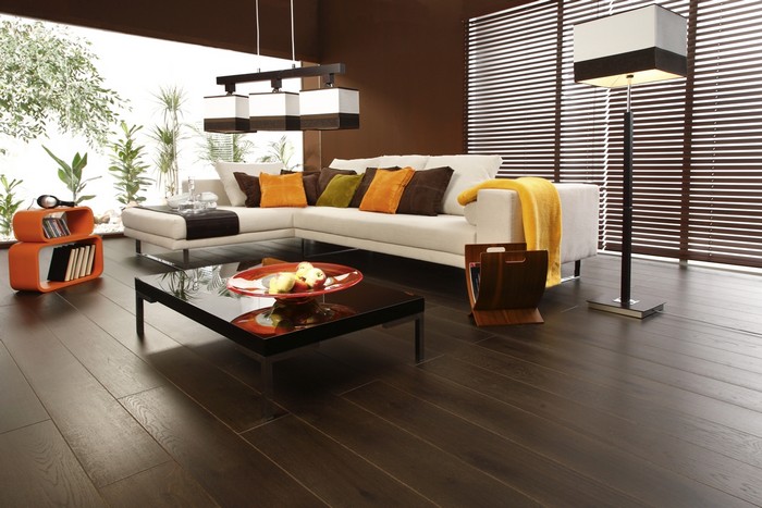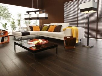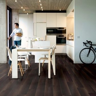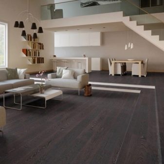 Laminat dunkle Farben veredelt den Raum und betont die Aristokratie der Besitzer einer Wohnung oder eines Hauses. Geeignet für den Innenbereich im klassischen Stil. Alles schwarze Laminat ist perfekt für Hi - Tech und japanischer Stil. Die dunkle Beschichtung mit einer leichten Fase wirkt vorteilhaft und ungewöhnlich. Es wird empfohlen, den dunklen Boden mit speziellen Mitteln zu waschen, um das Auftreten von Streifen auf der Oberfläche zu verhindern.