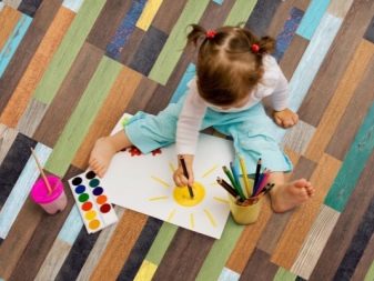 Um das Kinderzimmer hell und stilvoll zu machen, bieten Designer einen mehrfarbigen Laminatboden an.