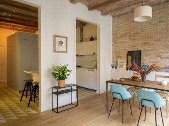 Die Beschichtung mit Imitation unter dem Stein im Wohnzimmer und Küche sieht originell und stilvoll aus. Solche Platten sind viel wärmer als Steinböden, so dass keine zusätzliche Heizung benötigt wird.