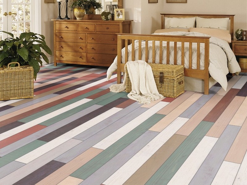 Mehrfarbiges Laminat sieht hell und sehr ungewöhnlich aus. Diese Art der Beschichtung wird oft in Geschäften und Büros eingesetzt. Es eignet sich auch für die Dekoration des Kinderzimmers.