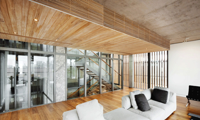 Durch das Verlegen der Abdeckung im Raum wird sie optisch erweitert. Gestapelte Bretter entlang, verlängern den Raum.