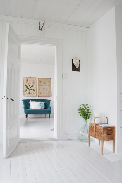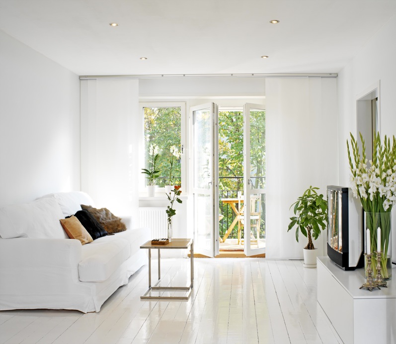 Sieht schönen weißen Bodenbelag in Kombination mit weißen Türen und hellen Accessoires aus.