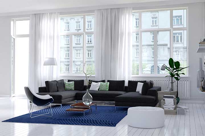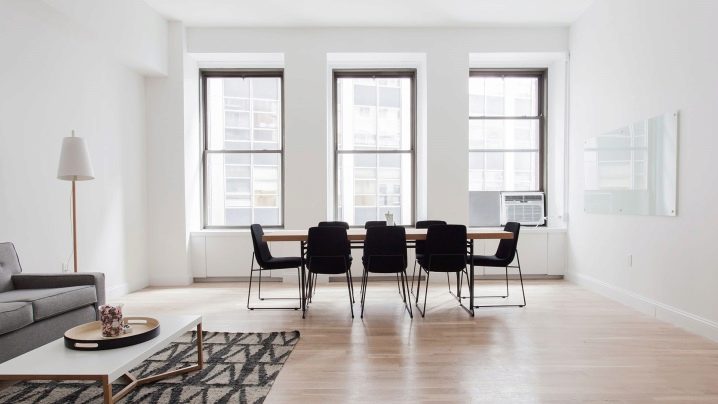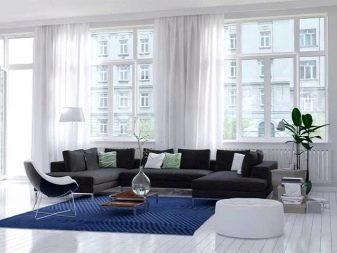 Sie möchten sich auf das Laminat konzentrieren, setzen Sie es mit kleinen dunklen Matten auf. Dieses Element wird großartig aussehen und auf einem hellen Hintergrund hervorstechen. Wenn die Raummaße zusammen mit einem leichten Bodenbelag im Raum erlauben, können Sie dunkle Vorhänge aus dicken und schweren Stoffen aufhängen. Dieses Element ist ideal für ein klassisches Dekor mit geräumigen Zimmern.