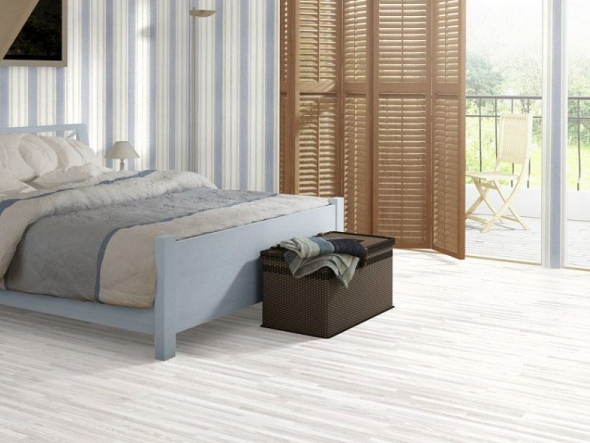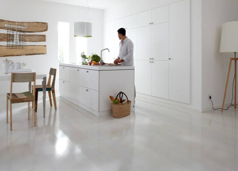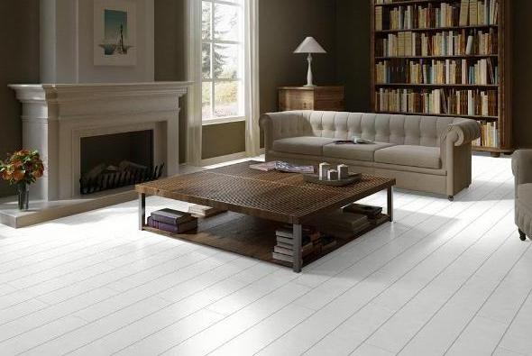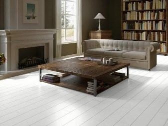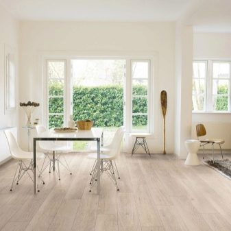 Weiß, Beige, Milch und andere ähnliche Laminate stehen für Leichtigkeit, Chic und Raffinesse. Helle Farben vergrößern den Raum optisch und erweitern ihn. Es wird empfohlen, diese Option in einem Raum zu installieren, in dem es keine künstliche oder natürliche Beleuchtung gibt. Es ist erwähnenswert, dass aufgrund dieses Bodens Sie die Designfehler und bestimmte Mängel verbergen können.
