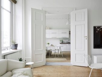 Designer empfehlen, sich für die Türen des Arrays zu entscheiden, aber wenn es um das Design eines modernen Interieurs geht, sollte ein Holzprodukt aufgegeben werden. Zu glänzendem Laminat kann lackiertes Segeltuch aufheben.