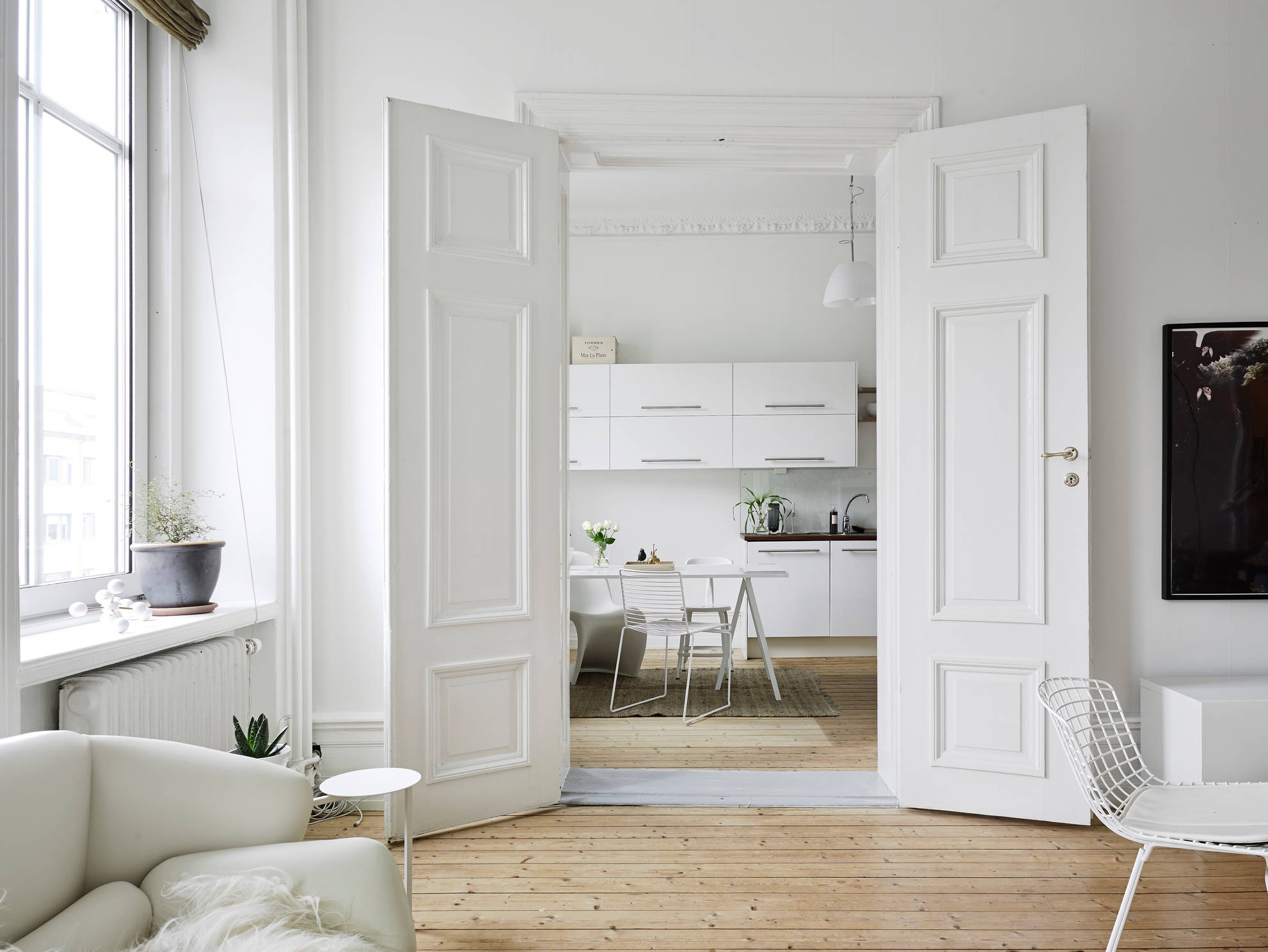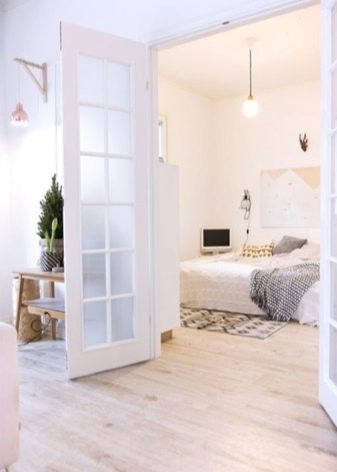 Jeder Designer weiß, dass die im Design verwendete Farbpalette sehr wichtig ist. Jeder Stil zeichnet sich durch eine bestimmte Farbpalette aus. Wände und Böden ziehen einen großen Teil der Aufmerksamkeit auf sich.Wenn das Zimmer Türen von weißer, milchiger oder beiger Farbe hat, können Sie an dieser Stelle das helle Laminat sicher verlegen. Ein solches Duett schafft eine Atmosphäre von Leichtigkeit und Frische im Raum. Zusammen mit einem durchdachten Lichtraum erhöhen Sie sich optisch.