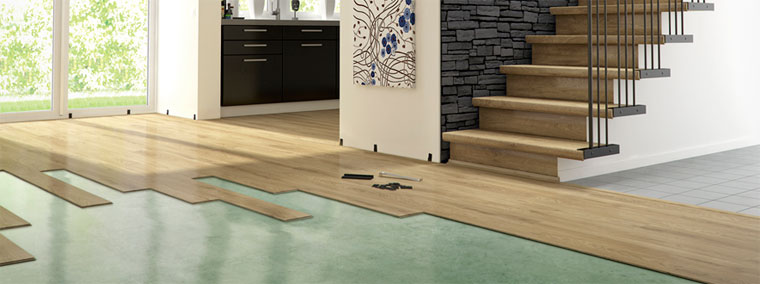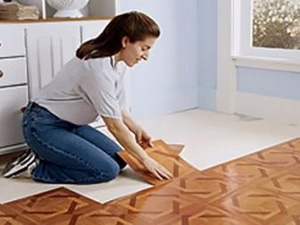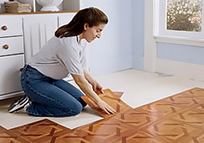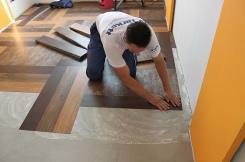 - Kunststofflaminat mit Kleberücken wird direkt auf den Boden gelegt. Kleber befindet sich über die gesamte Fläche des Panels. Es bleibt nur übrig, die Lamellen nacheinander sorgfältig zu kleben.