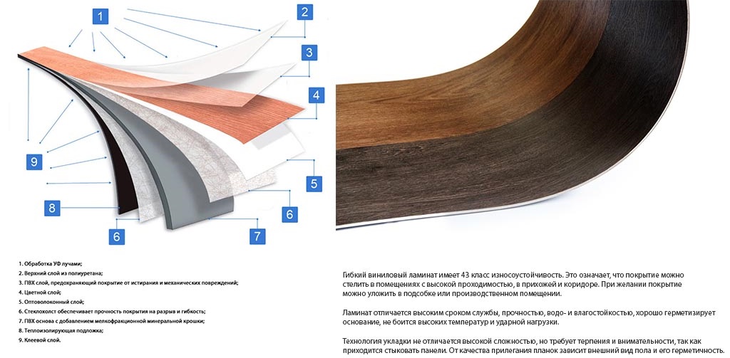 Kunststofflaminat - ziemlich flexibles Material. Dies wird aufgrund seiner geschichteten Struktur erreicht. Aber der Hauptschlag auf seinem Gebiet fällt auf die obere Schutzschicht. Je dicker es ist, desto länger dauert die Abdeckung. Die skrupellosesten Hersteller (die normalerweise die billigsten Produkte verkaufen) machen die minimalste Schicht der Polyurethanbeschichtung mit 0,1 mm dickem Aluminiumoxid, und wenn der Folienschnitt 0,5 mm ist, kann dieses Material auch an öffentlichen Orten verlegt werden.