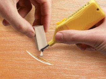Aufgrund der Tatsache, dass die Vorderseite des Paneels mit einem Texturbild aus natürlichem Holz bedeckt ist, müssen Sie den gewünschten Farbton auswählen. Abhängig von der Fläche des Defekts benötigen Sie möglicherweise eine bis mehrere Farben. Wenn Sie die Abdeckung wiederherstellen, können Sie die folgende Prozedur verwenden: