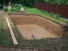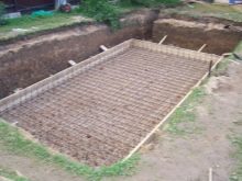 Die Tiefe muss um einige zehn Zentimeter (zum Beispiel 30) für die Wasserabdichtung erhöht werden. Die Grube zu graben ist überhaupt nicht schwierig.Wenn die Grube fertig ist, können Sie direkt mit der Konstruktion fortfahren.