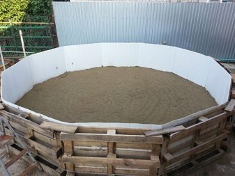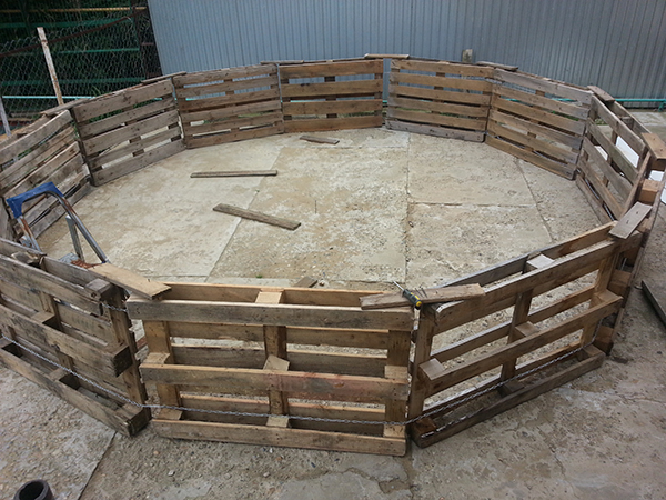 - Mit Paletten können Sie je nach Standort die Form des Pools wählen. Aus diesem Grund sollte eine Nische bis zu einer Tiefe von 30 Zentimetern ausgegraben werden, wobei der Umfang der Grube etwas breiter sein sollte als der Umfang der Paletten.
