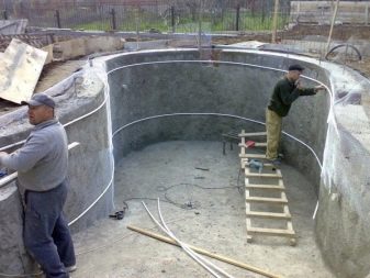 - Wenn Sie sich entscheiden, den Pool in zwei Ansätzen zu füllen, denken Sie daran, dass die Verstärkung ebenfalls verdoppelt werden sollte. Die zweite Bewehrungsschicht wird verlegt, um die vertikalen und horizontalen Teile des Reservoirs, dh den Boden und die Wände, zu verstärken.