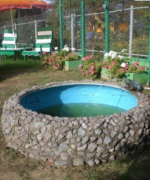 Handwerker Verwenden Sie Reifen von großen Haushalts- und Baumaschinen. Der Reifen sollte nach Ihrem Geschmack gewaschen und bemalt werden, zB aus einem alten Gummipool oder Poster. Von Holzpaletten bilden die Basis für einen hausgemachten Rahmen Pool. Das Gitter wird als Material für die Grube verwendet, Steine werden darauf gelegt. Diese Option eignet sich für dekorative Teiche als Dekoration.