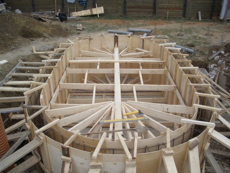 - Wenn der Poolboden aushärtet, gehen Sie zu den Wänden. Die Schalung muss mindestens 40 cm von den Lehmwänden entfernt sein.