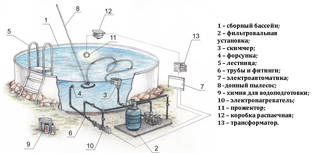 Die vorbereitenden Arbeiten umfassen die Entwicklung eines Plans und die Erstellung einer Zeichnung des Pools. In dem Plan ist es notwendig, die verlegten Rohre zu zeigen, die Abmessungen der Schüssel anzugeben und die Platzierung von Instrumenten zum Bewegen und Reinigen von Wasser zu zeichnen.