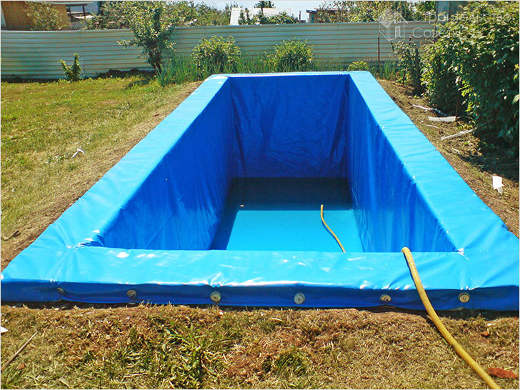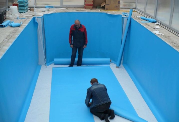 Um eine PVC-Folie für den Gerätepool zu verwenden, müssen Sie die Wände sorgfältig polieren. Um den Film an der Kante zu befestigen, wird ein Metallband daran befestigt. Sie können Schrauben verwenden. Auf diesem Band ist Film befestigt. Es sollte mit dem Gewicht von Wasser gegen die Oberfläche des Pools gedrückt werden. Verwenden Sie dazu keine Klebstoffe wie Kleber. Um den Film vor Kondenswasserbildung zu schützen, werden darunter bis zu 1 Zentimeter dicke Geotextilien verlegt.. Die Ränder der Folie können mit heißer Luft behandelt und mit Hilfe von flüssigem Kunststoff geglättet werden.