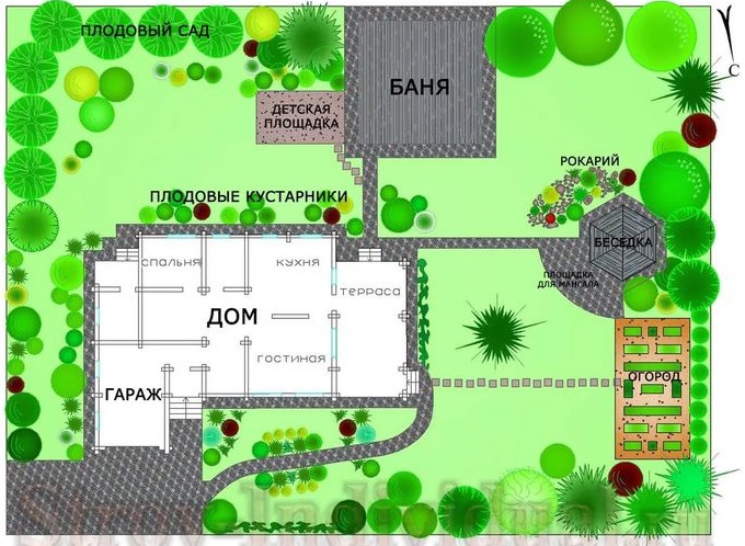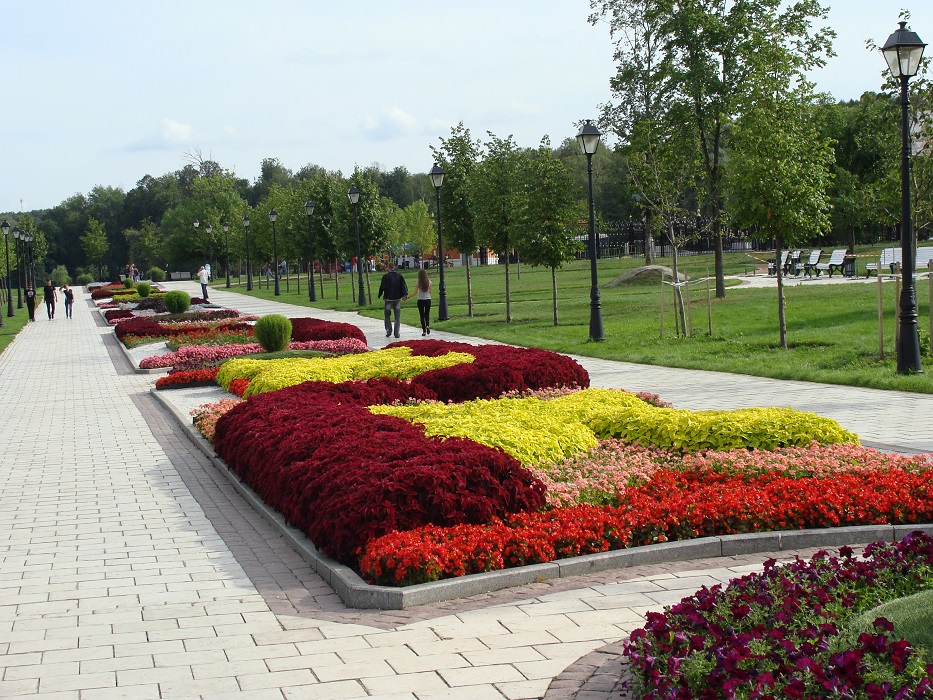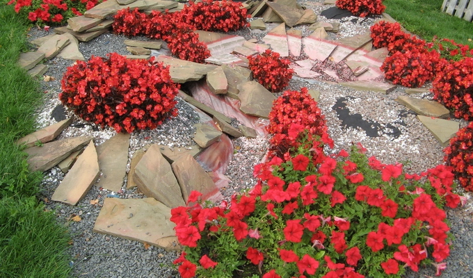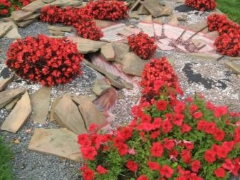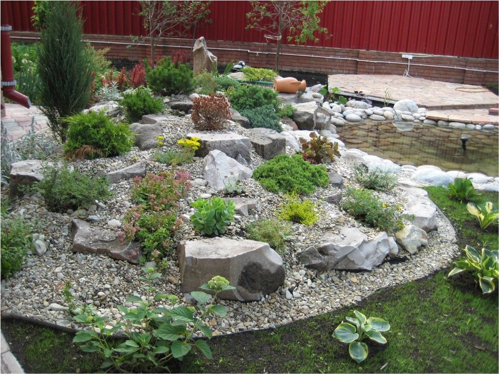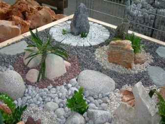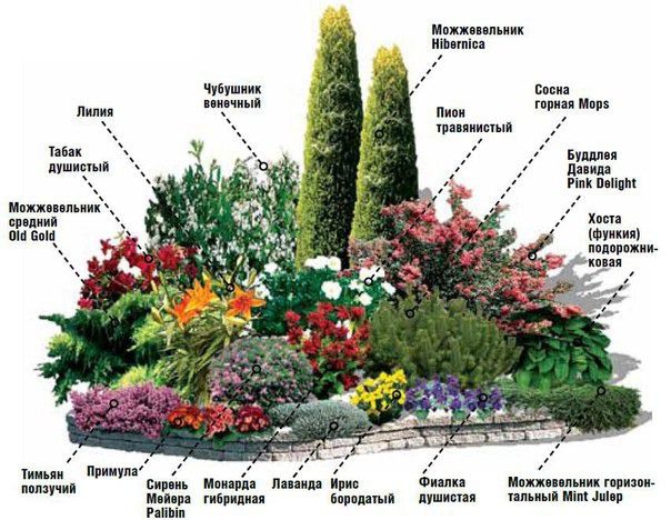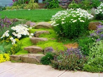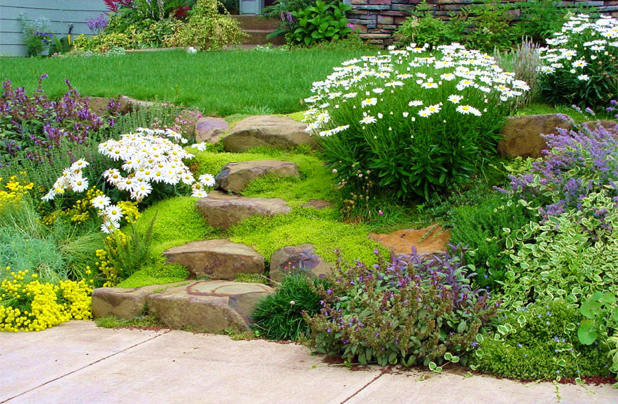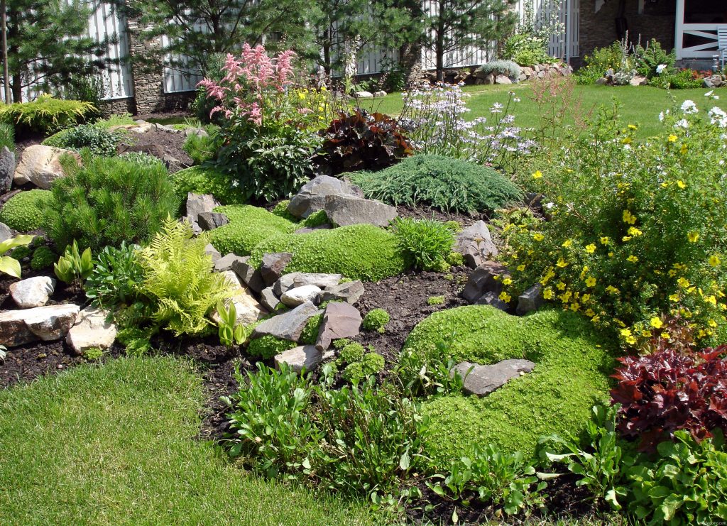 - Steingarten (Alpine Rutsche). Die Mitte des Blumenbeets ist mit einem großen Felsbrocken geschmückt. Dieses Element symbolisiert die Spitze des Berges. Es werden Pflanzen verwendet, die eine Neigung zum Wachstum in steinigen Böden haben. Oft sind dies Vertreter der Flora der subalpinen und alpinen Gebirgsgürtel.