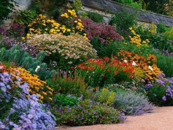 - Mixborder - Blumengarten schmücken das ganze Jahr. Die Besonderheit davon ist eine mehrstufige Struktur. Es sollten Jahrbücher auf der ersten Stufe gepflanzt werden, gefolgt von Biennalen, dann Stauden, Sträuchern und Zierbäumen. Das Wichtigste bei der Auswahl ist die Dauer der Blütezeit. Solche Blumenbeete können in Form eines Streifens von etwa 4 m oder eines Rhombus von etwa 5 x 6 m vorliegen.