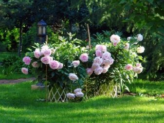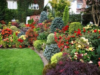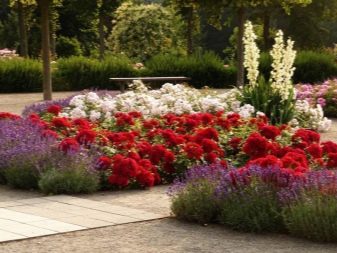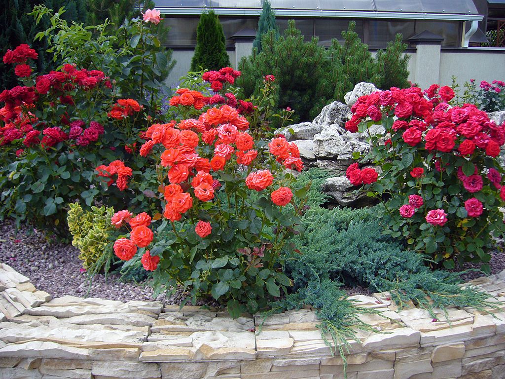 Rosen in Kombination mit Stauden werden oft durch Pfingstrosen, Körperkonserve und rotblütigen Geyher ergänzt. Solch eine einfache Kombination schafft eine unübertroffene Komposition. Mit Rosen sind gut Koniferen kombiniert.