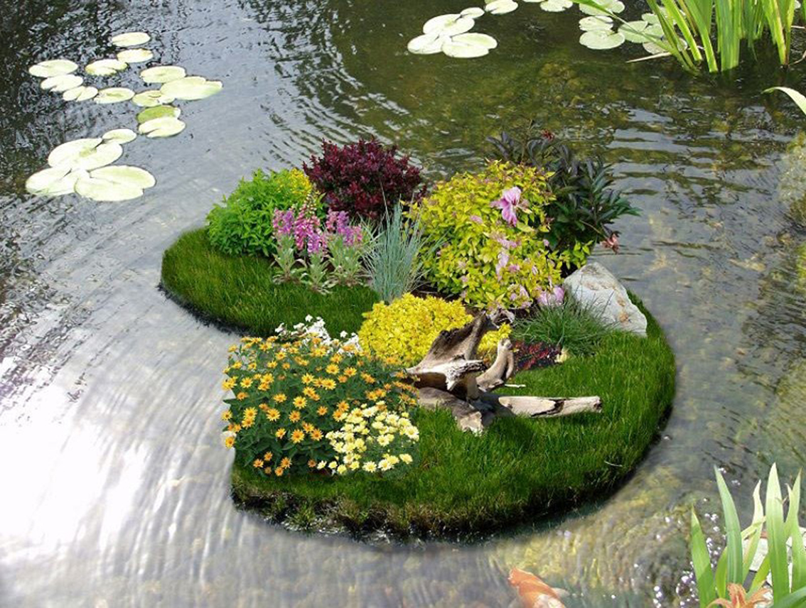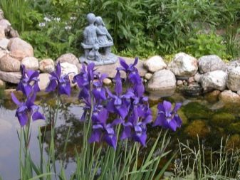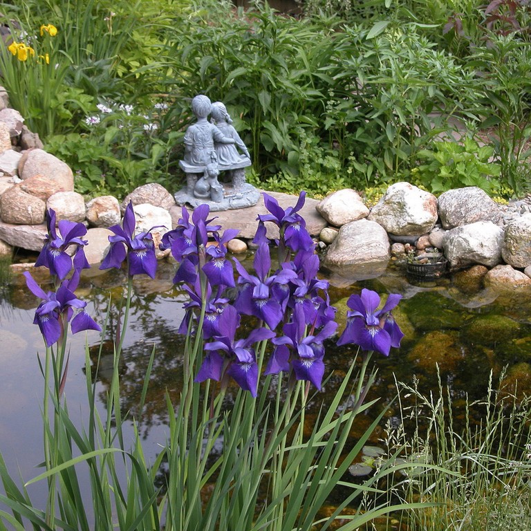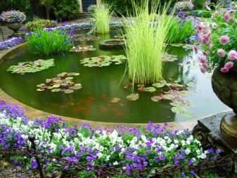 - Wasser Blumengarten erstellt mit einer erfolgreichen Kombination von Wasserpflanzen. Der Bau eines Blumenbeets ist wichtig für den Bau eines künstlichen Stausees im Garten.