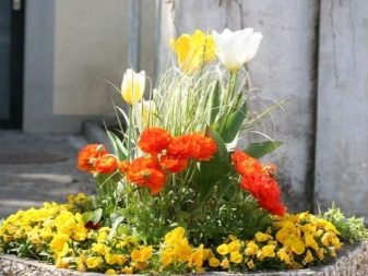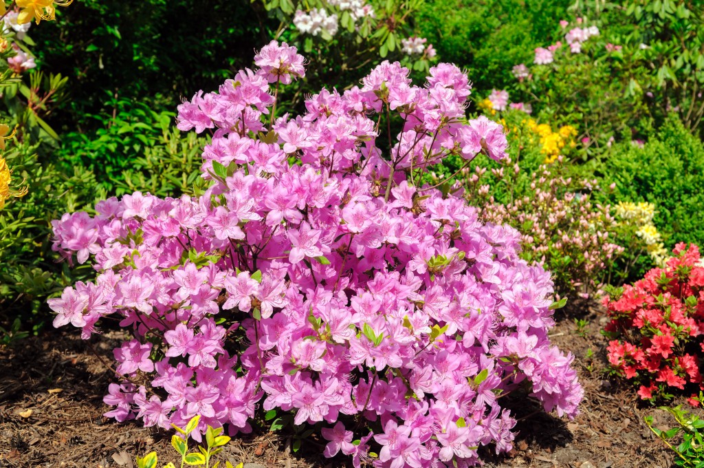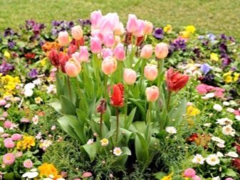 - Azalee. Teerosen, Tulpen und Gänseblümchen ergänzen perfekt die Komposition von anspruchslosen und frostbeständigen Azaleen.