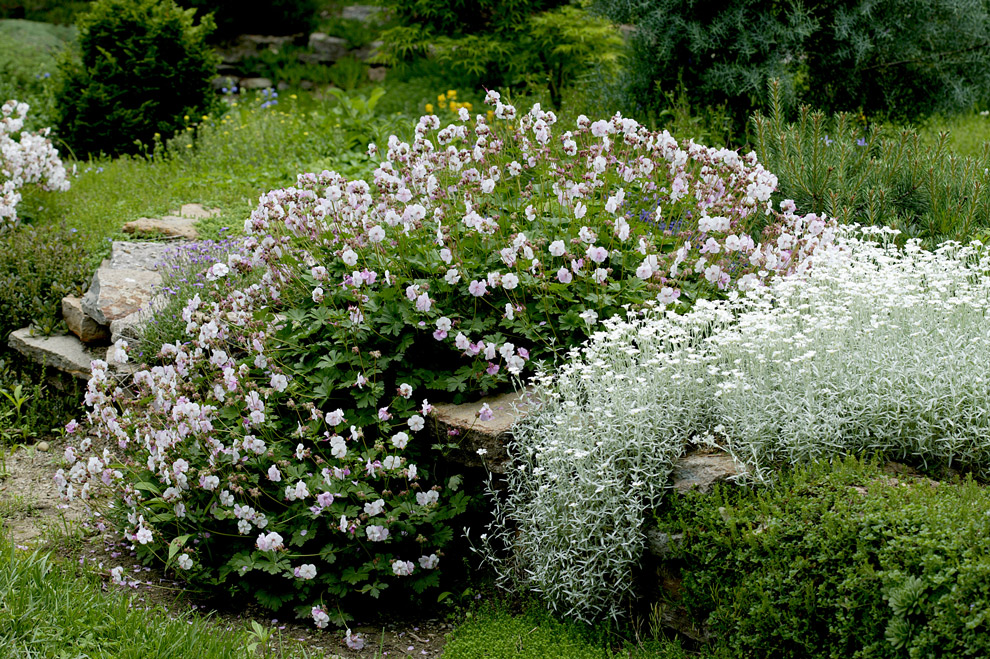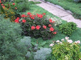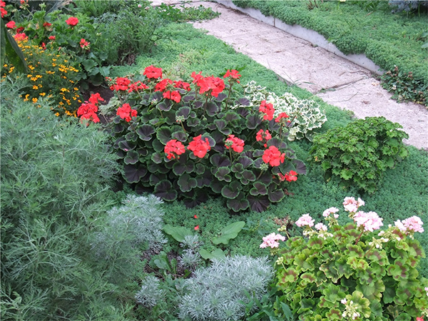 - Geranie (Pelargonium) hat große Blüten und schöne rötliche Blätter. Sie wächst im Halbschatten und wird mit anderen Stauden kombiniert.Die Blüte dauert von Mai bis Juni.
