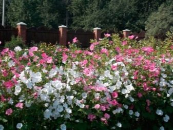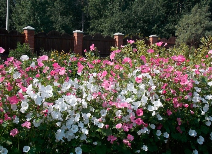 - Lavertera. Die Pflanze wird das Blumenbeet innerhalb von 2 Monaten nach der Pflanzung mit weißen, rosa und karmesinroten Farbtönen dekorieren.