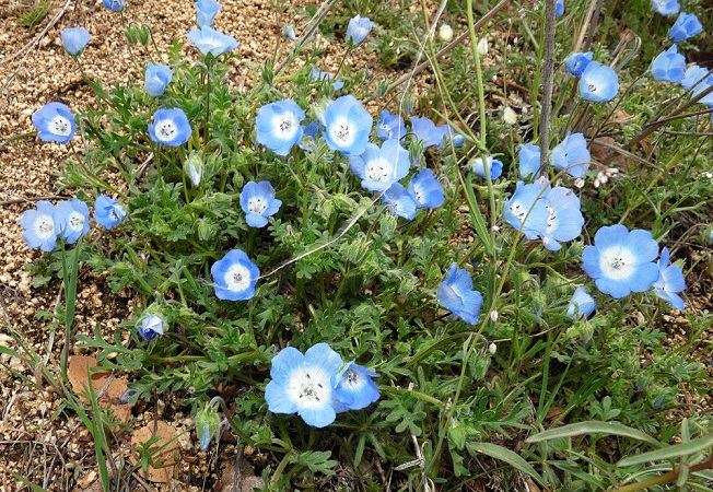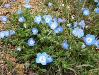 - Nemofila. Die Pflanze hat eine kleine Höhe - bis zu 25 cm. Openwork Blätter haben einen schönen gemusterten Rand.Die Blume wird für Blumenbeete, Grenzen und im Winter ohne Schutz verwendet.