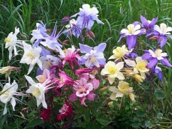 - Aquilegia. Die ungewöhnliche Struktur der Blüte macht sie für Gärtner attraktiv. Im Inneren ist ein gelber Kern, gefolgt von ovalen Blättern, und die Zusammensetzung besteht aus Blütenblättern mit scharfen Enden. Die Farben der Blütenblätter hängen von der Sorte ab.