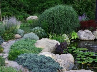 - Steingarten hat eine sichtbare Ähnlichkeit mit der vorherigen Ansicht. Zwischen großen Steinen sprießen kleine Sträucher und andere niedrig wachsende Pflanzen.