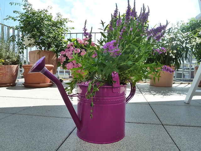 - Dekorieren Sie eine gewöhnliche Gießkanne mit einer farbigen Verzierung und machen Sie sie zu einem zentralen Element des Dekors.