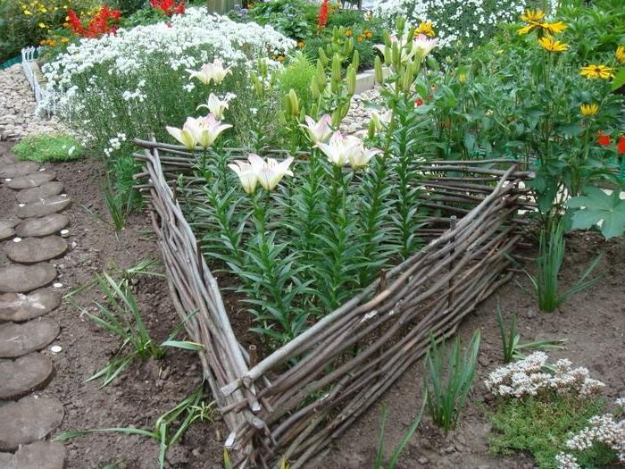 Lassen Sie uns auf dem Zaun für die Blumenbeete wohnen. Sie können einen fertigen Zaun aus geschmiedetem Metall oder Holz kaufen. Eine weitere Option ist eine hausgemachte Hecke. Produkte aus einem dekorativen Stein sehen effektiv aus. Das Prinzip der Berechnung unterscheidet sich nicht von der Konstruktion von Gartenwegen.