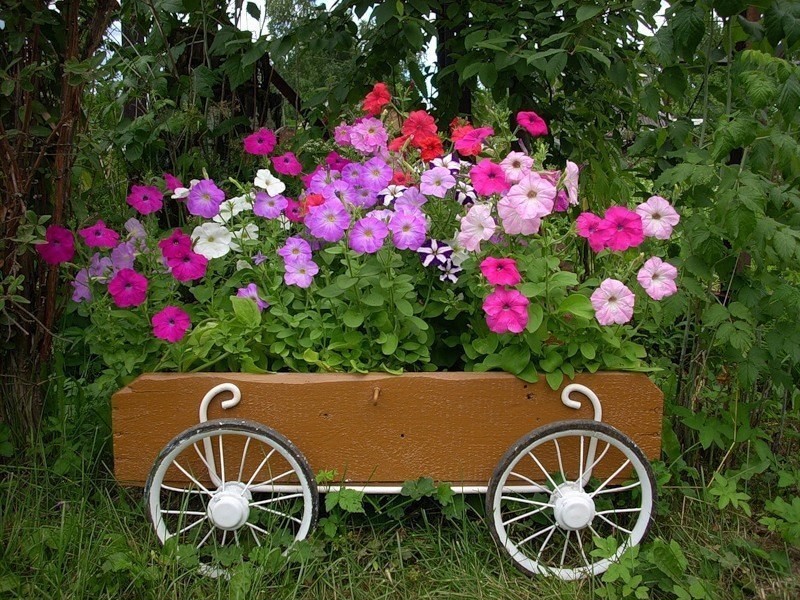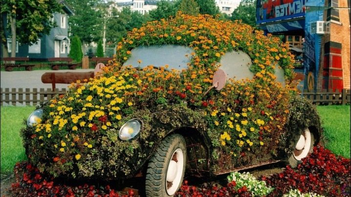 Um eine ungewöhnliche Komposition zu erstellen, machen Sie einen Drahtrahmen in Form eines Autos, eines ungewöhnlichen Vogels oder eines Regenbogens. Eine solche Struktur kann in einem bestimmten Teil des Gartens installiert oder in Form eines mobilen Blumengartens hergestellt werden.