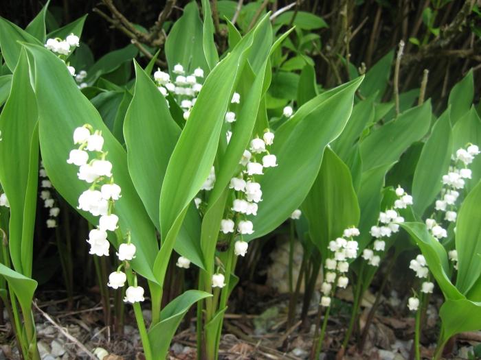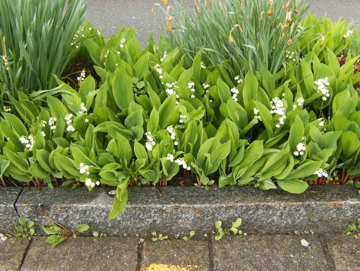 - Pferdeshow. Maiglöckchen sind auf schattigen und halbschattigen Flächen mit feuchtem Boden gepflanzt. Schöne Blätter dieser Pflanzen schmücken den Blumengarten, auch nach der Blüte.