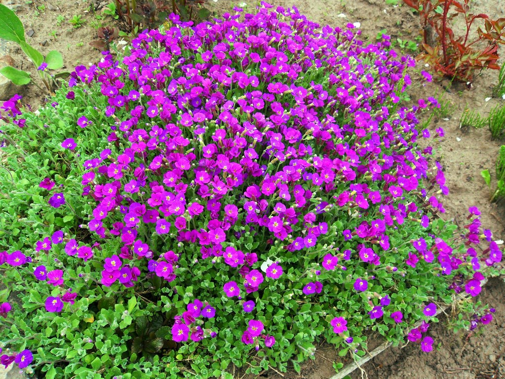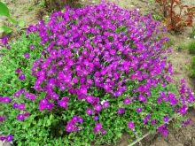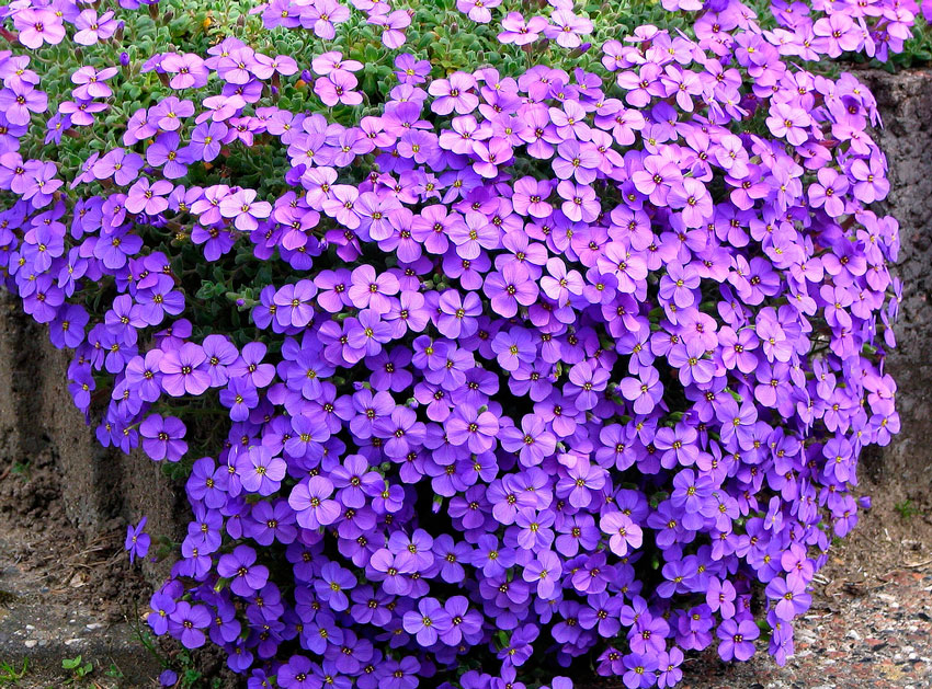 - Aubretia. Eine Pflanze mit vielen kleinen Blüten in weiß, blau, lila oder anderen Schattierungen. Die Höhe der Büsche beträgt 10-13 cm und der Blühprozess dauert bis zu 45 Tage.