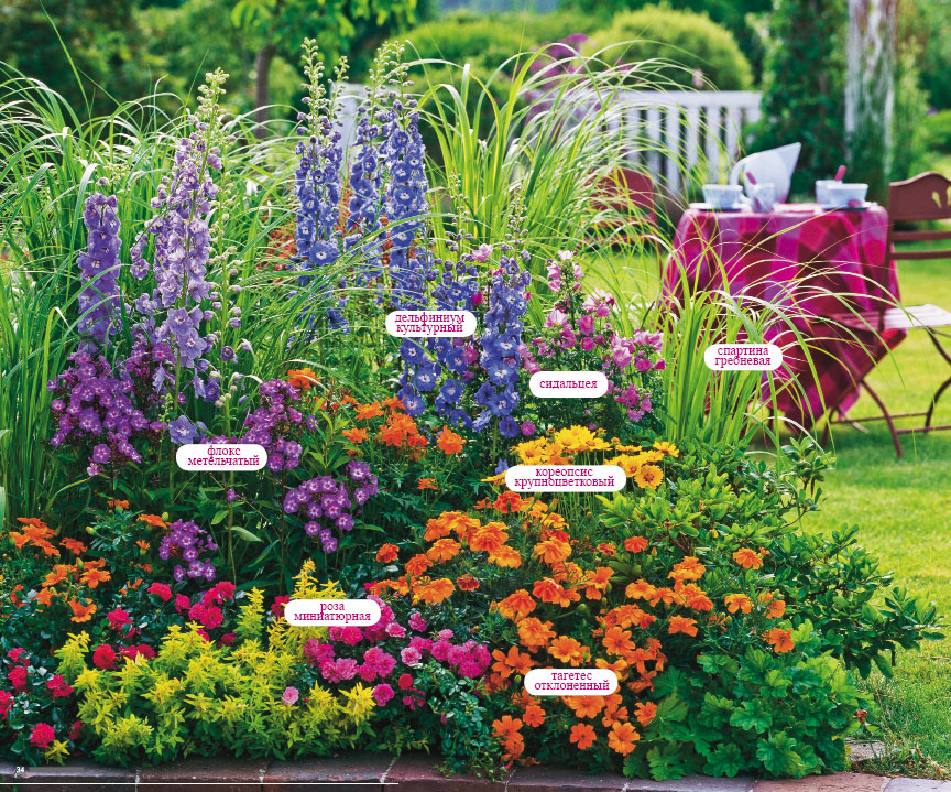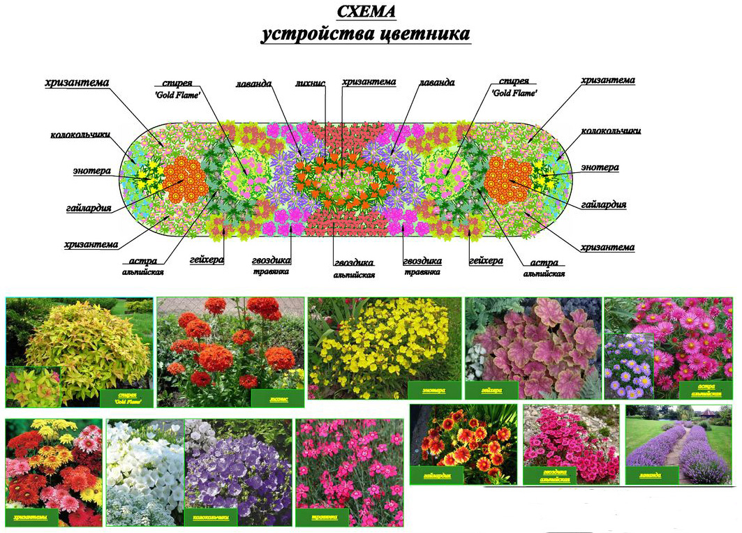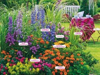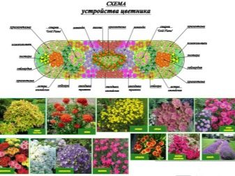 Um ein schönes Blumenbeet zu gestalten, empfehlen Experten, je nach Größe und Form ein bestimmtes Bepflanzungsschema zu beachten. Die hellsten und höchsten Blüten sind im zentralen Teil des Bodens gepflanzt. Für die mittlere Stufe sind mehrjährige niedrig wachsende Pflanzen am besten geeignet, die die Gesamtzusammensetzung harmonisch ergänzen.