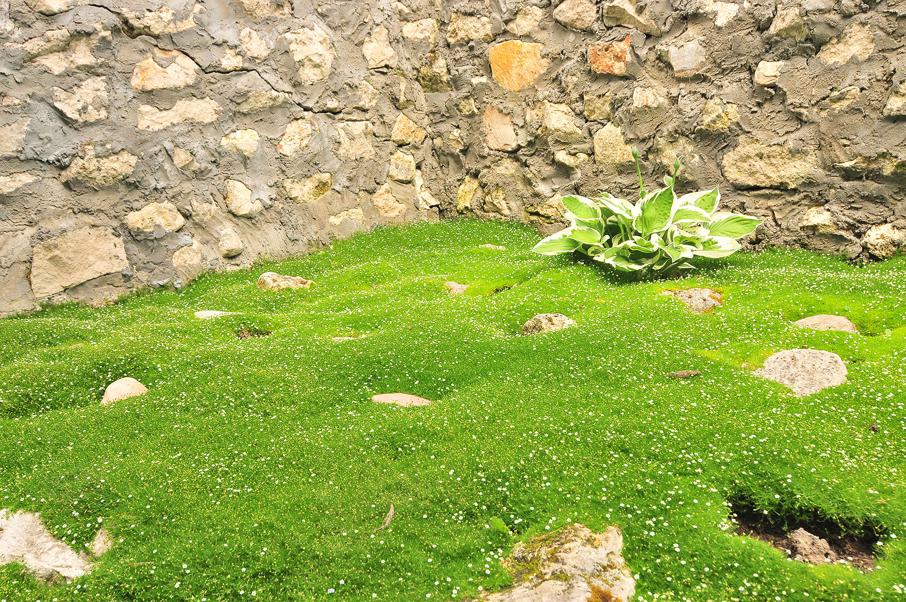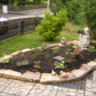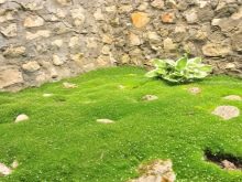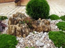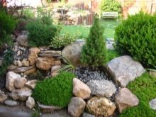 Unter den Steingärten ziehen sie Kerben mit einer Tiefe von 0,2 m heraus, um sicherzustellen, dass Unkraut entfernt wird.Geotextilien werden auf den Boden der Vertiefung gelegt, der Zweck der Anwendung ist der gleiche. Achten Sie darauf, eine Schicht aus Kies und Sand einer großen Fraktion zu erstellen, um übermäßige Feuchtigkeit und Fäulnis des Wurzelsystems zu vermeiden. Dann wird das Substrat mit einer Erdschicht bedeckt, um etwa ein Drittel große Steine gelegt und mit Kies verstopft.