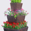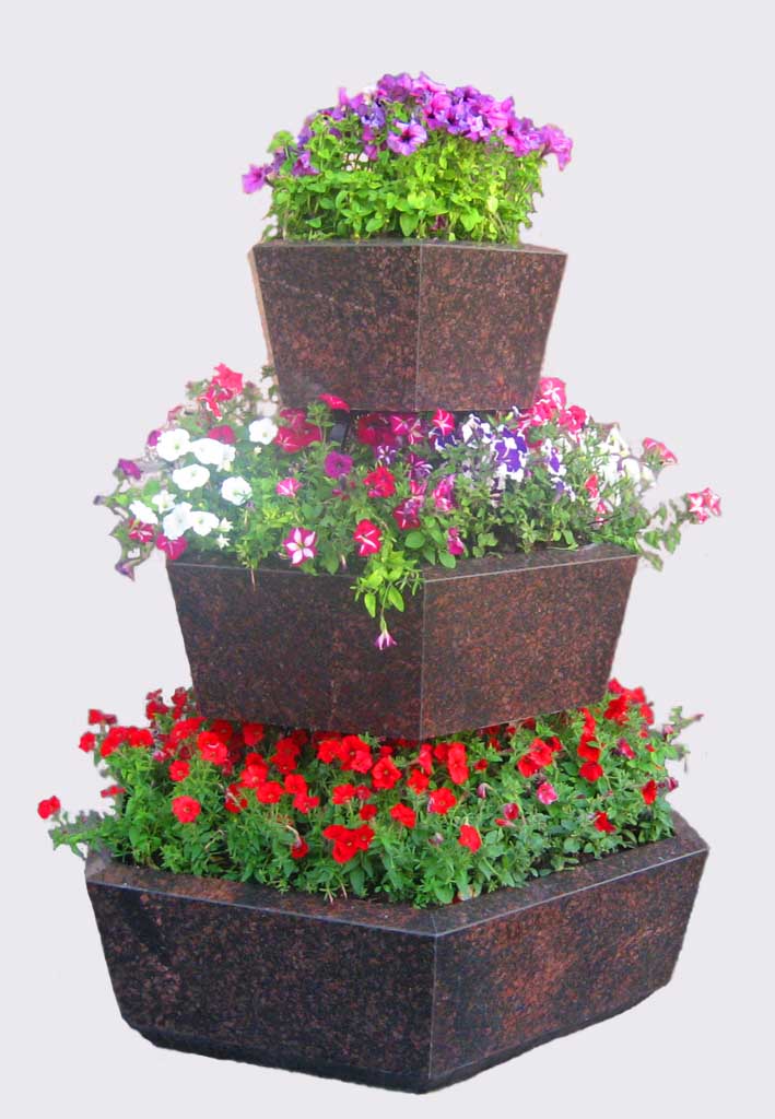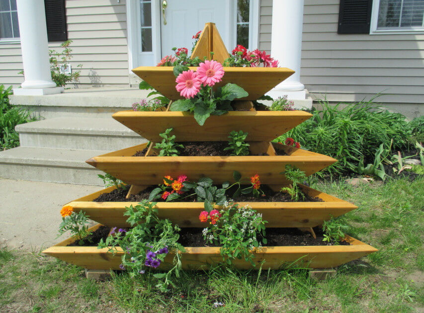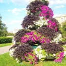 Stöckelblumenbeete werden sehr gut wahrgenommen, ihr Vorteil ist der minimal belegte Raum. Solche Objekte sind selbst mit der Platzierung einer großen Anzahl von Farben leicht ohne Hilfe zu erstellen. Die untersten Schichten werden besonders groß gemacht, und wenn sie sich der Spitze nähern, werden neue Segmente alle schmal. Aber das ist nicht unbedingt eine Pyramide, Sie können eine runde, rechteckige und quadratische Form wählen.