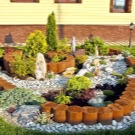 Ungewöhnliche Steingärten entstehen durch die Kombination von großen und kleinen Steinblöcken. Die Verwendung von Jahrbüchern, die insofern gut sind, als sich die Wahrnehmung der Komposition jedes Jahr ändert, trägt dazu bei, das Design attraktiver zu machen. Dieser Vorteil rechtfertigt sogar verständliche Schwierigkeiten bei der jährlichen Anpflanzung neuer Anpflanzungen.